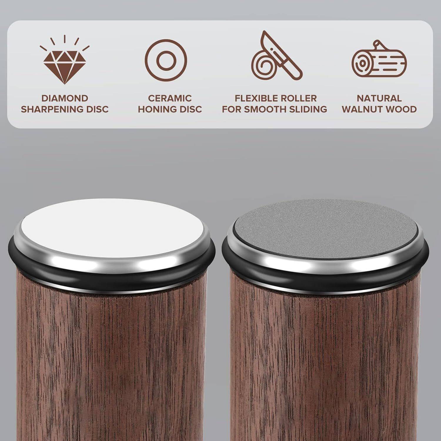 High-Grade Materials: The roller and magnetic base are made of high-grade natural wood, the roller is equipped with diamond discs(400# & 1000#). Grinding with the diamond 400# disc and polishing with the diamond 1000# disc, you will always have a very sharp knife.